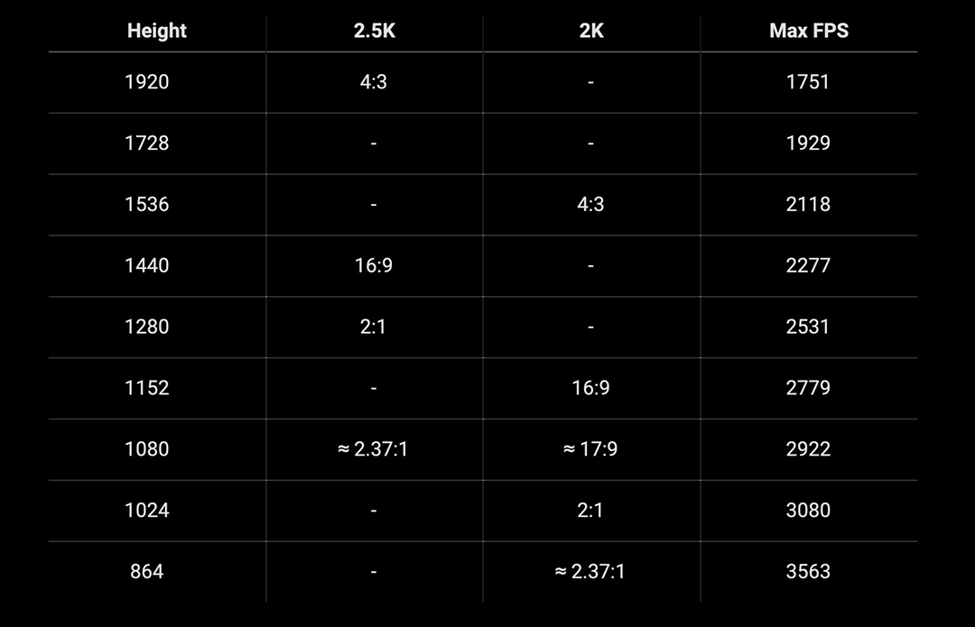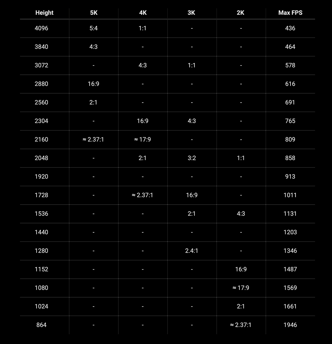 5K 5120 x 3840 (4:3) up to 464 fps. (ANA x2).